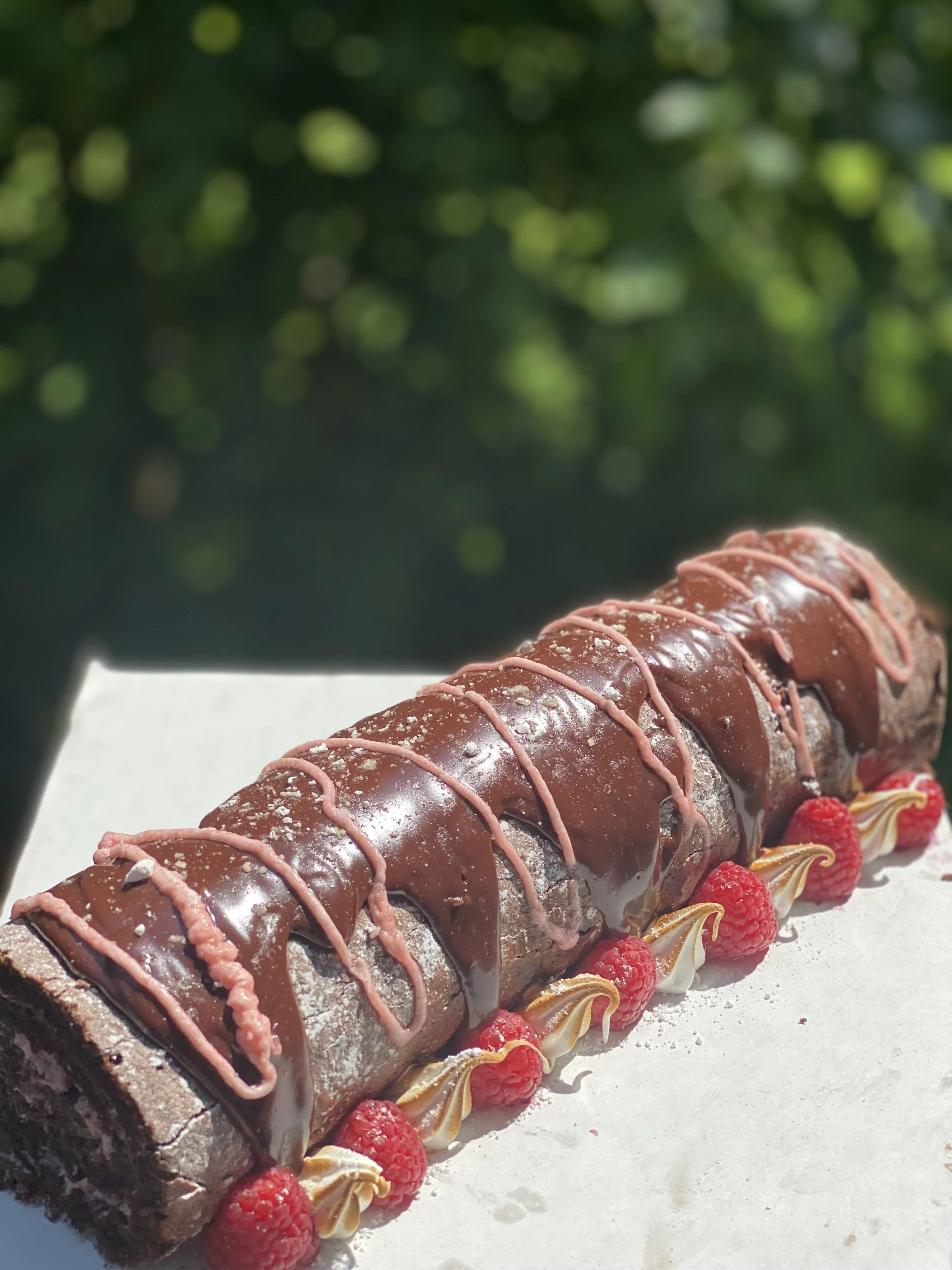 Put a wire rack over a piece of parchment paper. Lift the cardboard and cake and place on the wire rack. Carefully pour or spread the glaze down the length of the cake, and spread however you like. Chill to firm up the glaze. Garnish with shaved chocolate, fresh raspberries, or whipped cream